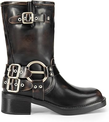 / Women S Mid Calf Boots Square Toe Motorcycle Boots With Buckles Women S Motorcycle Boots Low Block Heel Design
