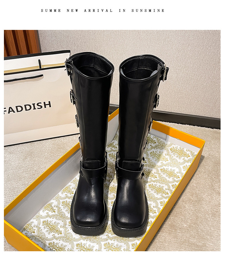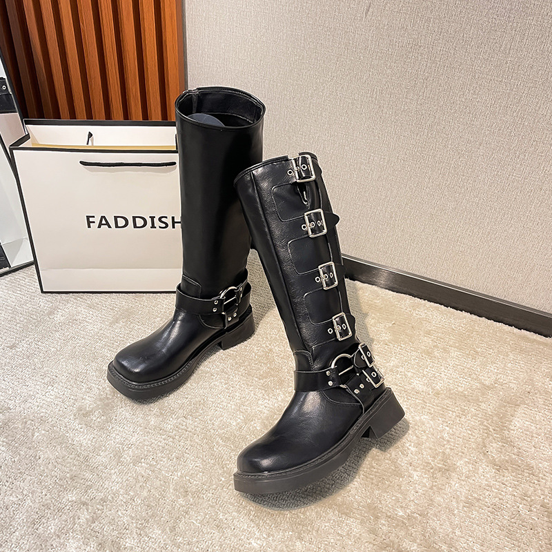 2024 Genuine Leather Thick-Heeled Martin Boots For Women Western Cowboy Boots Retro Maillard High-Top Belt Buckle Square-Toed Knight Boots