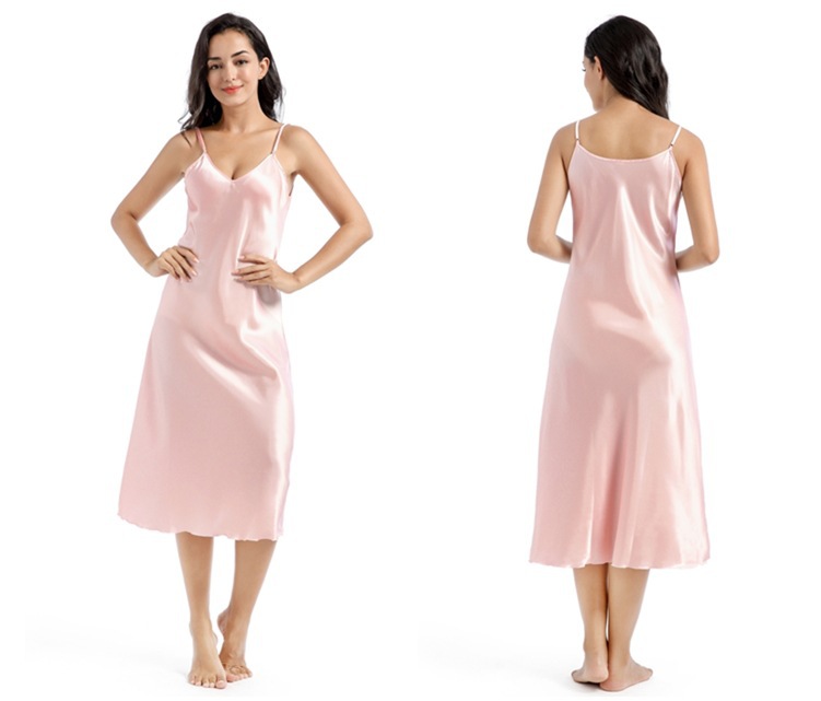 • Mid-Length Slim Sexy Large V-Neck Suspender Thin Denim Silk Nightgown Pink