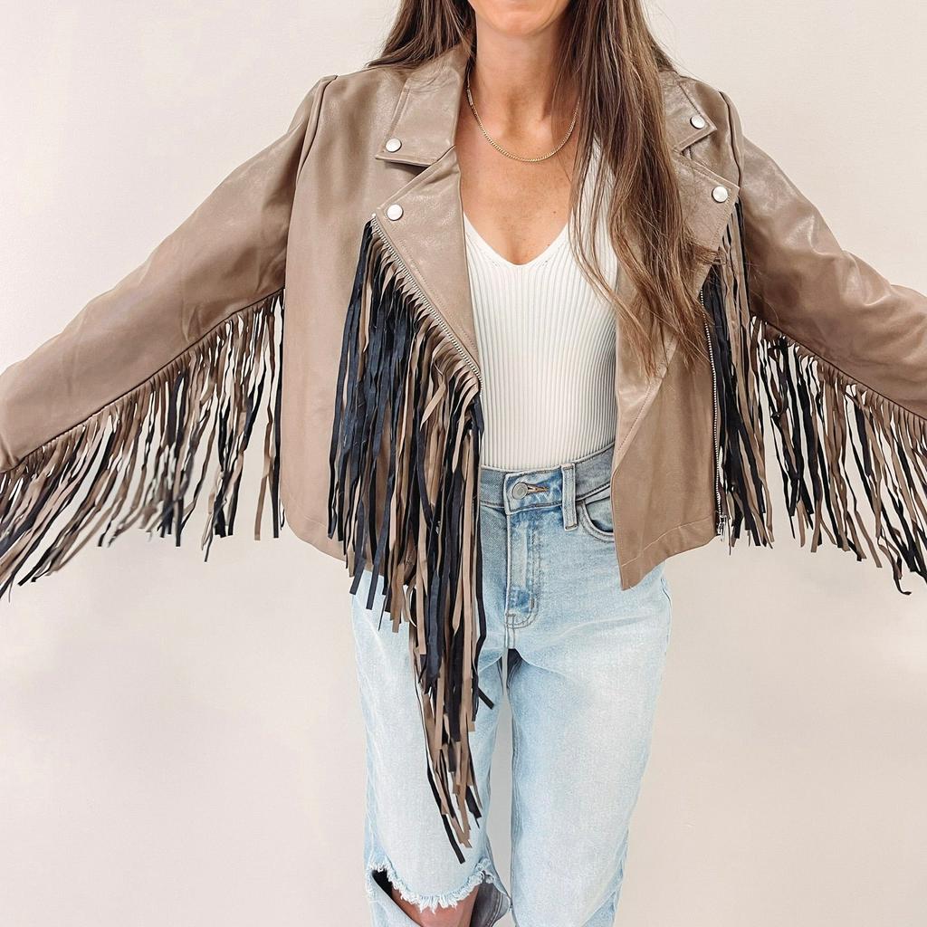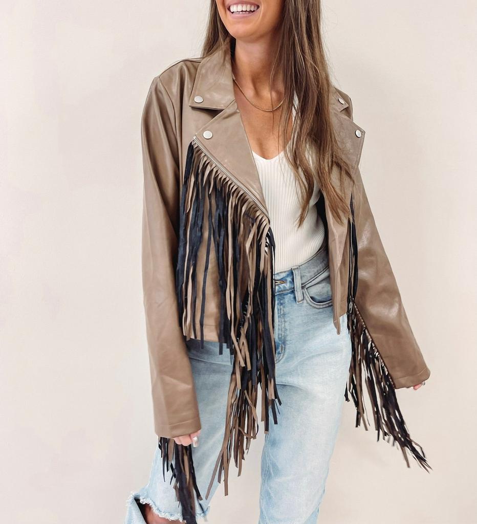 / Brown Fringe Faux Leather Jacket