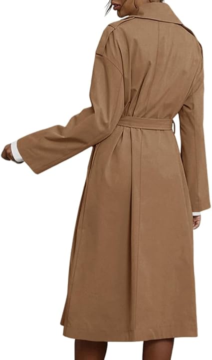 2024Women's Double Breasted Long Trench Coat Lapel Mid Length Jacket with Belt Coat